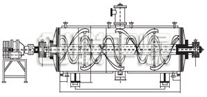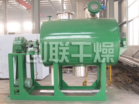 本機是一種新穎臥式間歇式真空干燥設備,濕物料經(jīng)傳導蒸發(fā),帶有刮板攪拌器不斷清除熱面上的物料,并在容器內推移形成循環(huán)流,水份蒸發(fā)后由真空泵抽出。