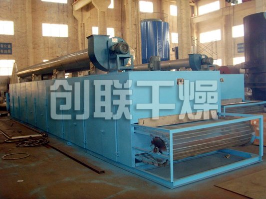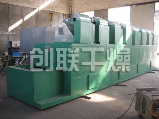 物料由加料器均勻地鋪在網(wǎng)帶上,網(wǎng)帶一般采用12-60目不銹鋼絲網(wǎng),由傳動(dòng)裝置拖動(dòng)在干燥機內移動(dòng)。干燥機由若干單元組成,每一單元熱風(fēng)獨立循環(huán),部分尾氣由專(zhuān)門(mén)排濕風(fēng)機排出,廢氣由調節閥控制,熱氣由下往上或由上往下穿過(guò)鋪滿(mǎn)物料的網(wǎng)帶完成熱量與質(zhì)量傳遞的進(jìn)程,帶走物料水份。網(wǎng)帶緩慢移動(dòng),運行速度可根據物料溫度自由調節,干燥后的成品連續落入收料器中。上下循環(huán)單元根據用戶(hù)需要可靈活配備,單元數量亦可根據需要選取。
